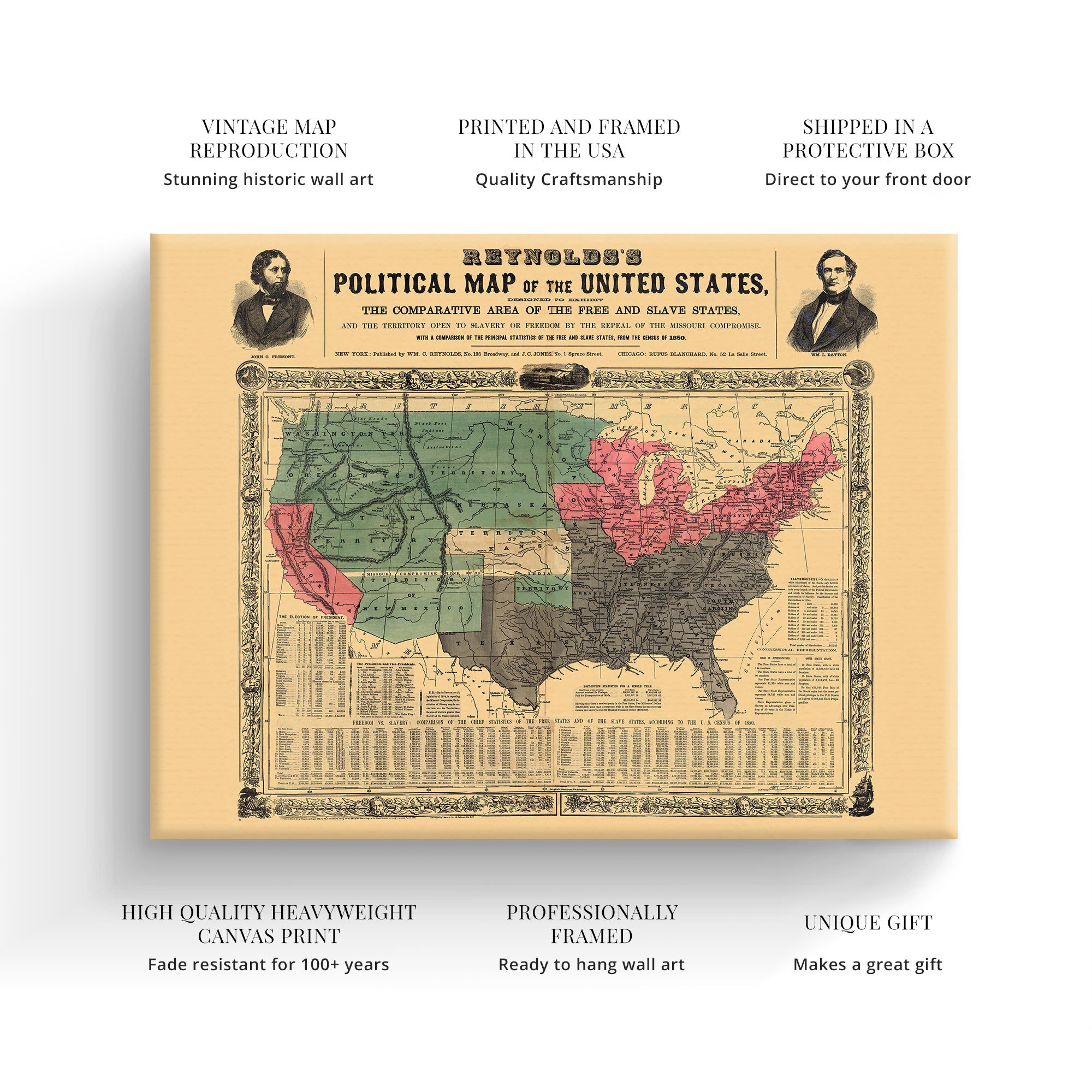 1856 Political Map of the United States of America Canvas Wall Art